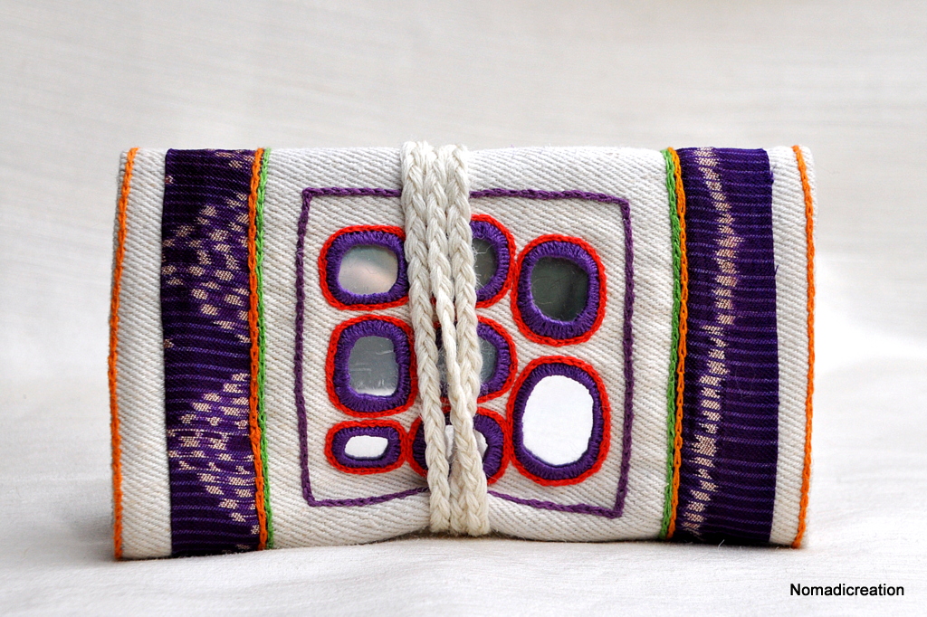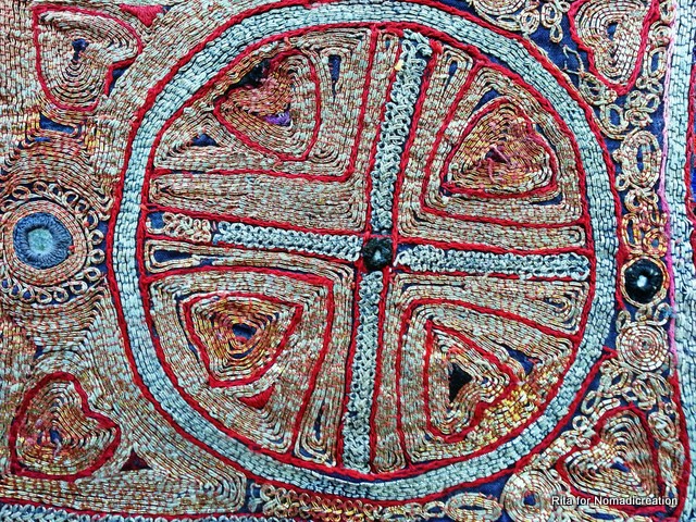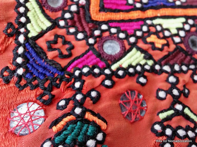 This is an art form in which mirrors of various shapes are fixed on to the fabric through embroidery. In recent times however, mirrors have been replaced by reflective luminescent metal pieces of different shapes and sizes. Coins are also possible to use, and I have started to learn this technique with cut out pieces of CD.