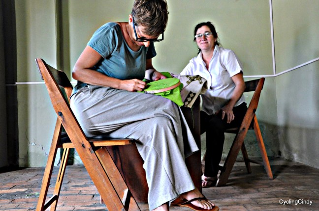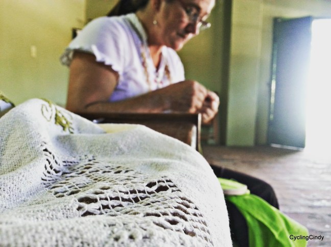 When we try to get me placed into a course for embroidery, we fail 5 times. ‘Come back next week, then there is someone who can talk to you,’ followed by ‘the lady in charge is on holiday,’ to ‘the lady in charge, who was on holiday, is sick now,’ ends in ‘I will teach you,’ and so it happen maestra Emilia is teaching me the techniques of ao po’i. The practice of beautifying hand-woven cotton, without patterns and a lot of counting.