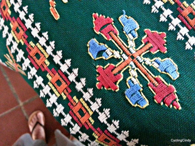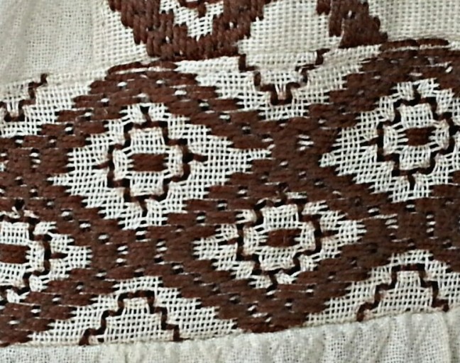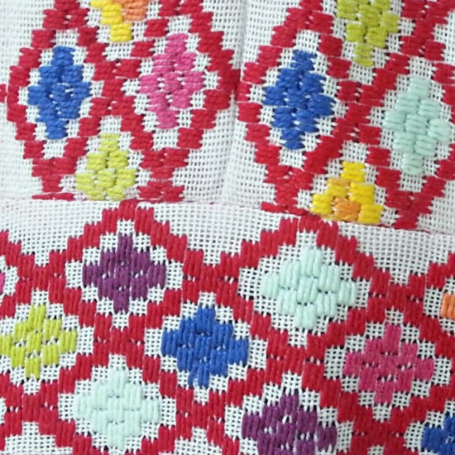 I had three one hour lessons about the basics on how to embroider ao po’i style while I was in Paraguay’s ao po’i capital Yataity. It’s all about counting and keeping concentrated. The photo below shows clearly a very poor remembering of the original.