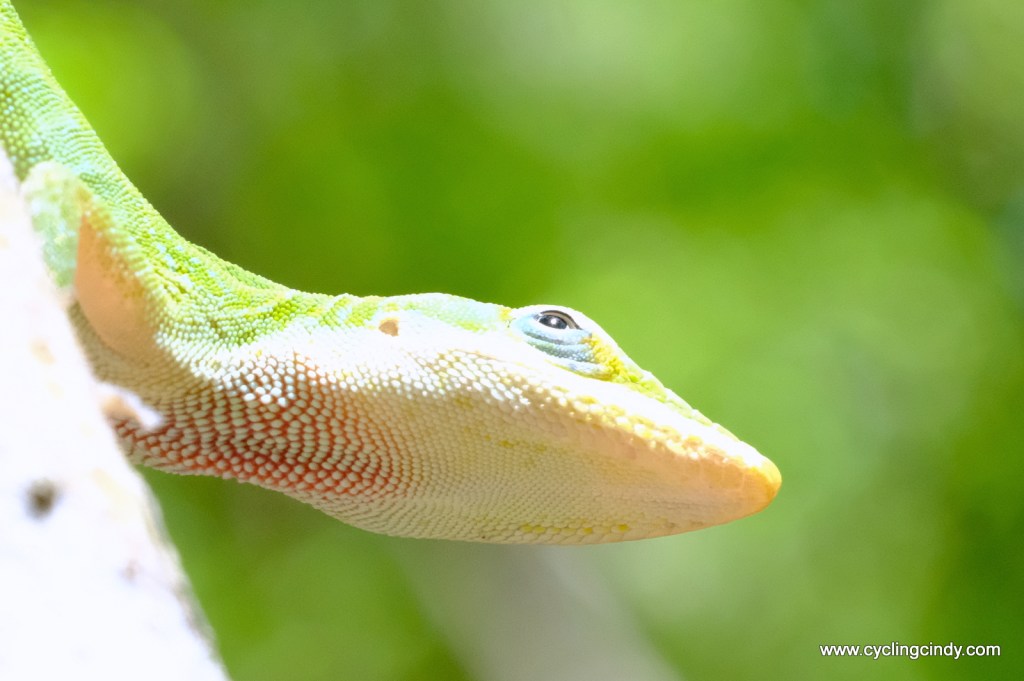Well, try not moving when you are the active type. Soon I am hunting frogs and lizards, trying to have them pose in front of my lens. I succeed. I am able to come up with the most pretty lizard and frog portraits. Although I am not doing much, I am as busy as can be. Besides cooking, I keep changing the position of my tent, I read and embroider and I search for new species of lizards. They seem to be everywhere, building nests near where I sit. Falling out of the trees from above me. Watching a very green species I notice a new pattern for embroidering. His eye!
