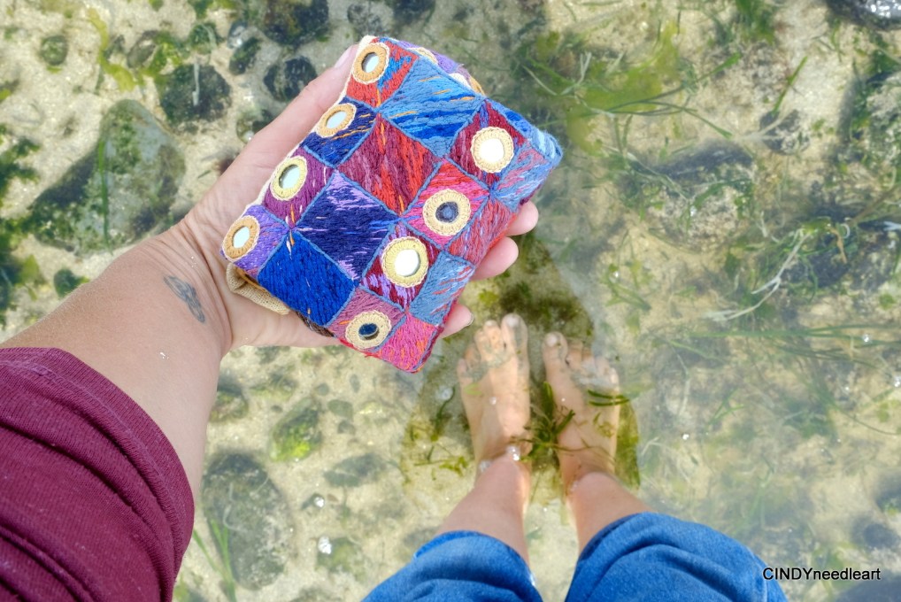 When the piece of fabric with the Indian technique called shisha mirror application was fully finished, I admired the mirrors on the checkered pattern while we were at the coast of Peru, the sea and its clear colors.