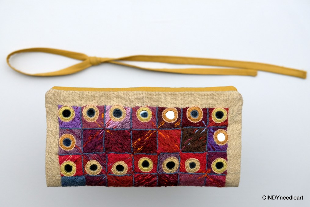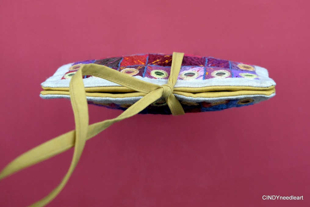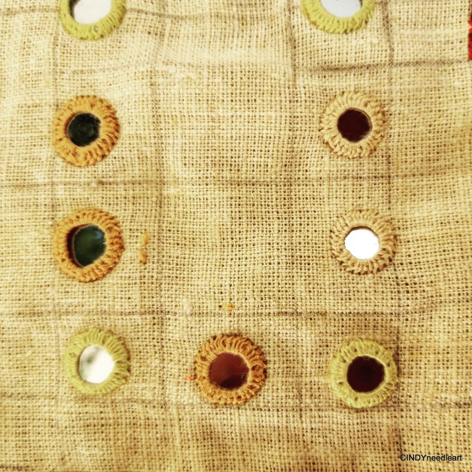 I used shisha mirror application with a chain stitch around each mirror. The checkered blocks are in Romanian couching as are the blue dividing lines. The cord works like a tie, and is adjustable.