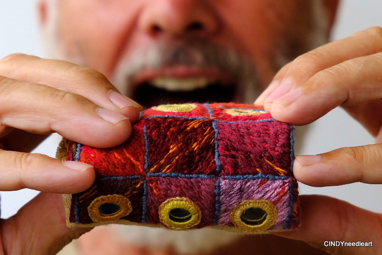 Soon after we started our motorbike trip through South America and took the piece with me. Although we had to pack the motorbike as light as we could, I exchanged heavy boots for more embroidery stuff. That was a mistake indeed. Now I took off with one pair of sandals and soon would be battling ice cold toes but I had plenty of material.