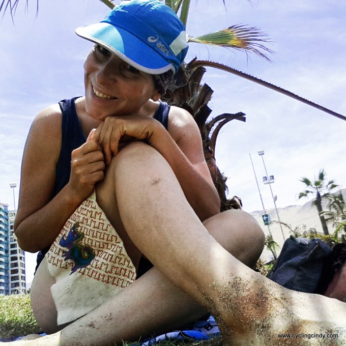 I once was inspired by a piece of indigenous art from a museum in Peru. On a clay pot were depicted mythical beasts and from a hostel in Lima I took an indigenous pattern to fill up the space around the fantasy animals. This piece of fabric gave me tremendous joy as I worked on it in the most lonesome, spacious and incredible beautiful camp spots. Mostly in the Atacama desert and prior in the Peruvian desert along the coast. This is a post about cycling through the Atacama desert.