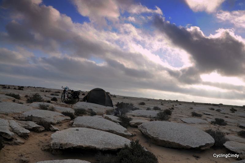 Almost every spot I pitched the tent I felt I wanted to stay an extra day but this was almost never possible. The only spot where I was able to do so was when I rode out of a town, knowing the distance I had to cover before I could buy groceries again and able to stock up more than I needed, I felt I could find a great spot not too far out of town, not too far to cover a distance truly overloaded. Here I was, in the driest desert, they say, with a sprinkle of rain while I enjoyed the solitude, the incredible wideness and the total stillness, while embroidering on this piece of hemp cotton fabric. It was pure bliss. It sure was as I even could make a tiny fire. And do not look over the specialy formed boulders…