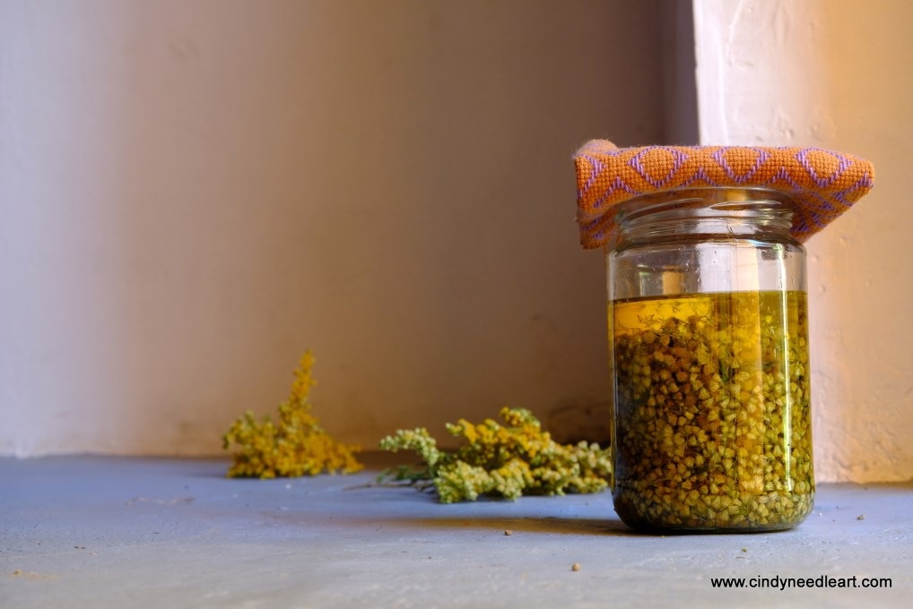 Fill a jar 1/4 to half of the way with dried goldenrod flowers. Pour an oil over the flowers until the jar is full. You can infuse the oil the slow way, the solar way or the speedy way.