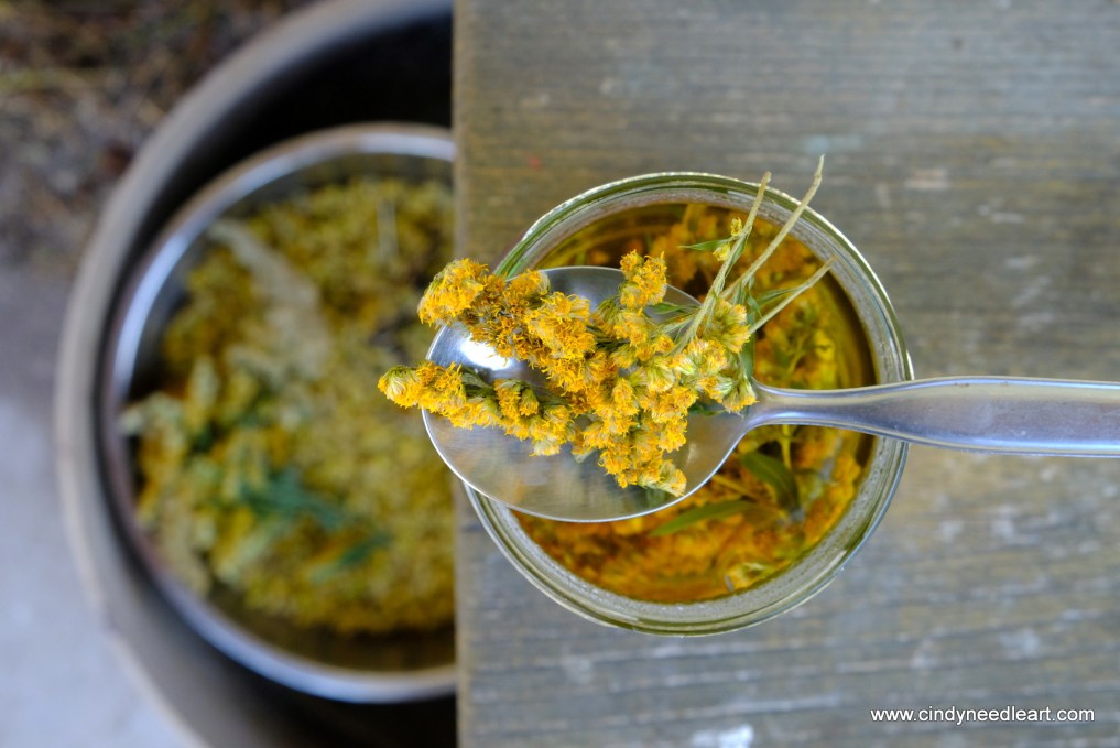Use around 2 tablespoons of fresh flowers per 1 cup of water. If using dried flowers, use half as much (1 tablespoon per 1 cup of water). Cover and steep for 15 to 20 minutes before straining. Sweeten with (goldenrod infused) honey, if desired.
