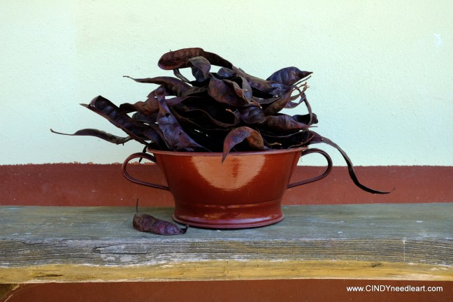 I broke the pods into pieces before I put them in the dye pot. The photo above shows the part I used for grinding powder. They simmered for half an hour to an hour before I took the broken pieces of pods out of the dye pot. With the colored water left I placed the fabric in it and had it simmering for another half an hour to an hour. The fabric was left overnight in the dye bath.