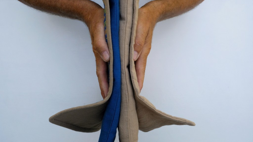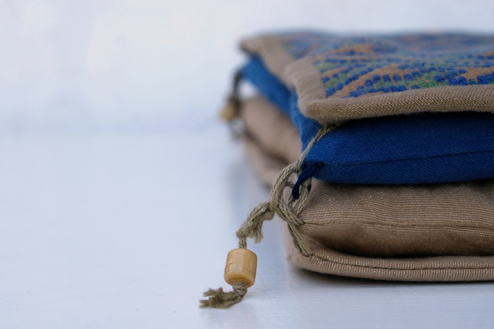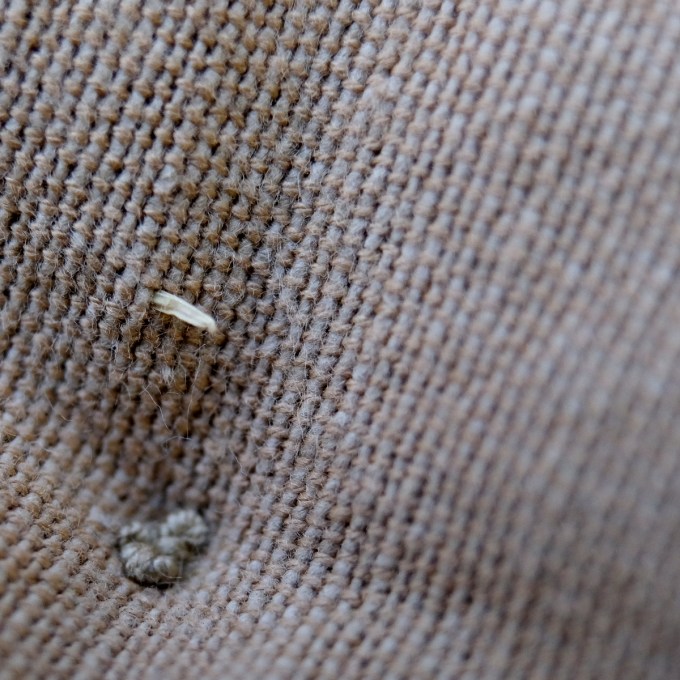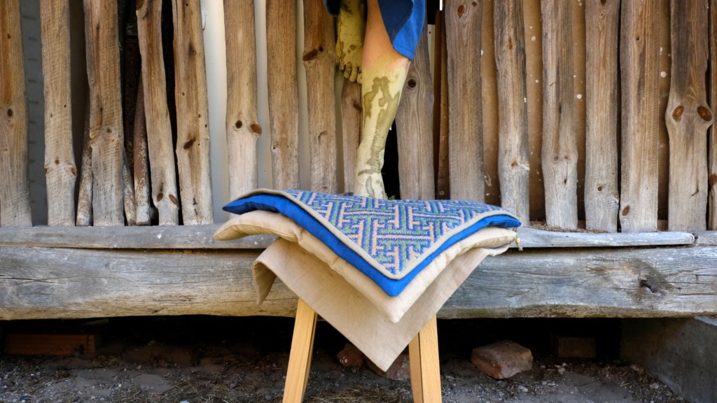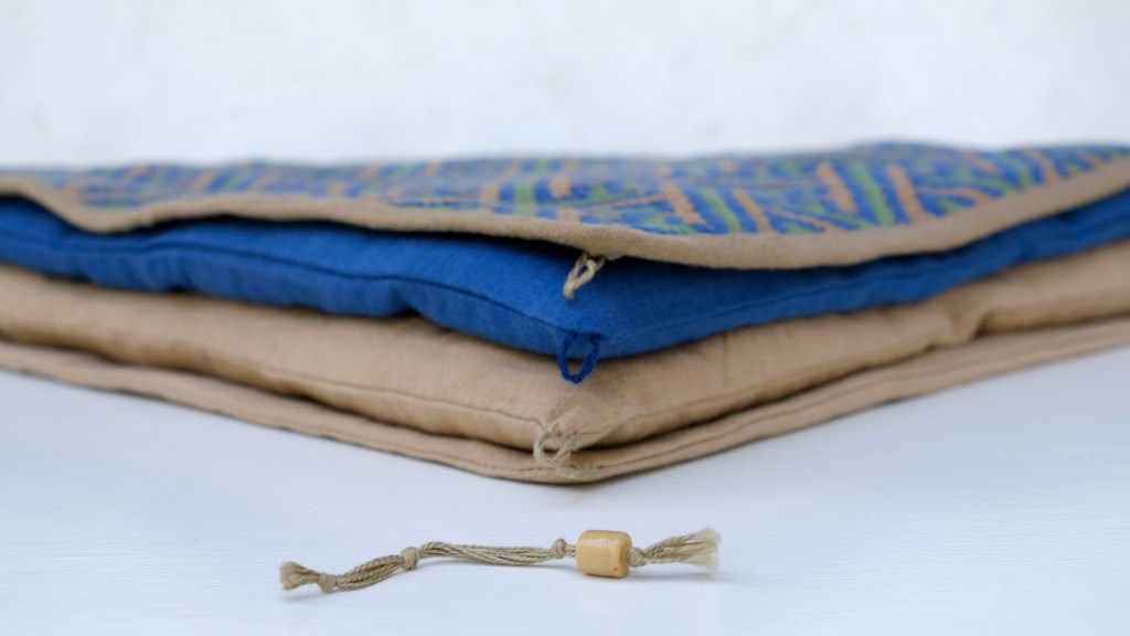 Blue pillow is a cotton mixture with some synthetic. It is top stitched and filled with cleaver. The two ocher pillows are a mixture cotton/synthetic. One is filled with cleaver and the flat one with an old pullover. Both are top stitched.