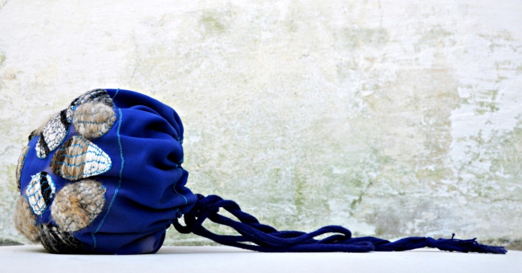 Fabric: a roadside memorial flag blown away by the harsh Patagonian wind. Lined with blue cotton mixture.