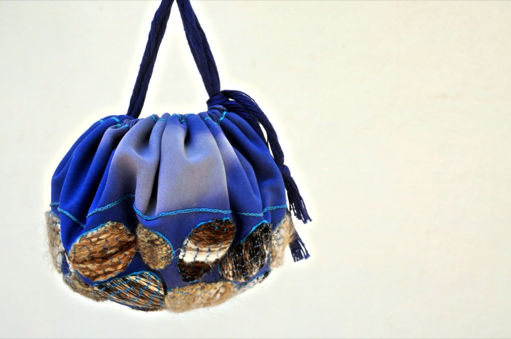 Fabric: hemp cotton with possibly some linen, lined with my own discarded blouse. Closure cord is made from the blouse too.