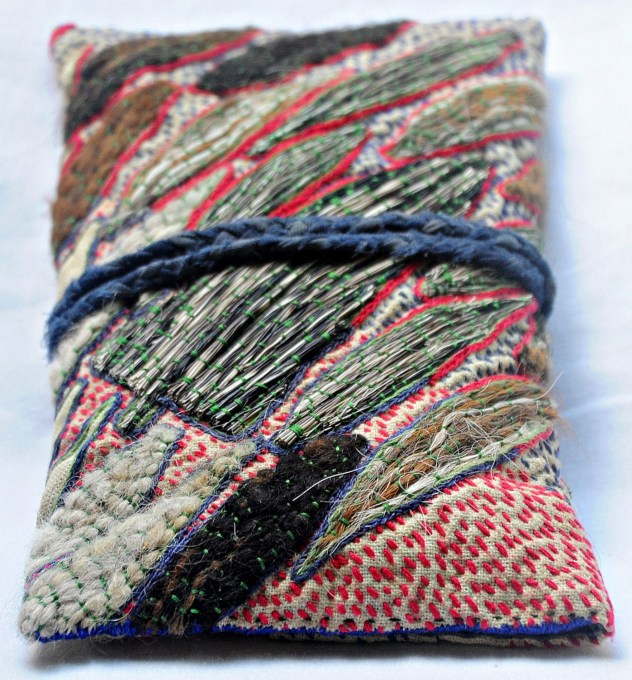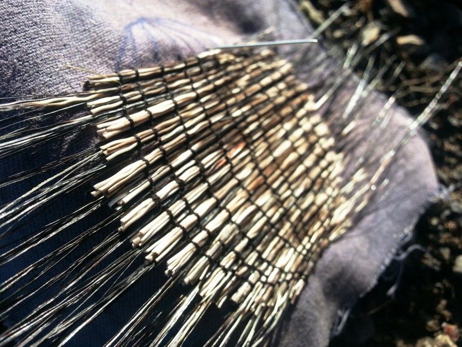I made these pouches with the hair of hunted wild boar and deer and a deceased goat. Fur of lama’s and alpaca got stuck in the fences and I could simply pick it. Unfortunately, road kill took care of the hair of nutria, countless foxes, birds of prey, skunks and a rabbit. A sort of ostrich, a nandu, died for reasons unknown to me. On another occasion I tried to incorporate the needles of cacti. It was difficult, but I kept trying until it worked out.