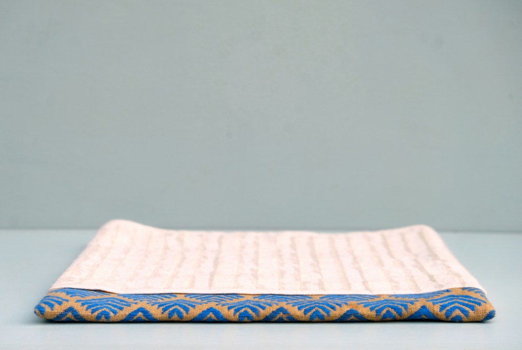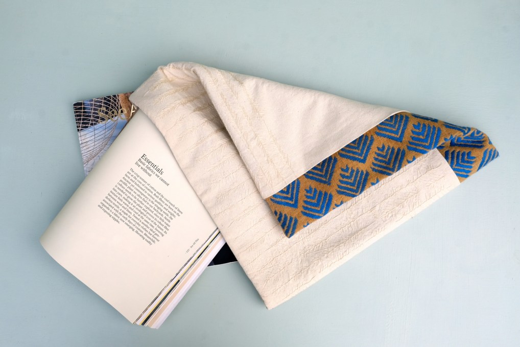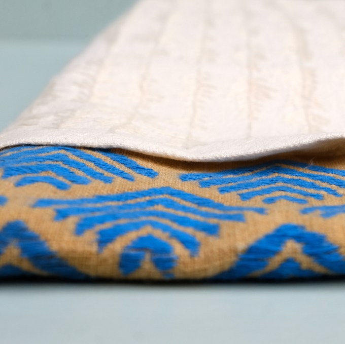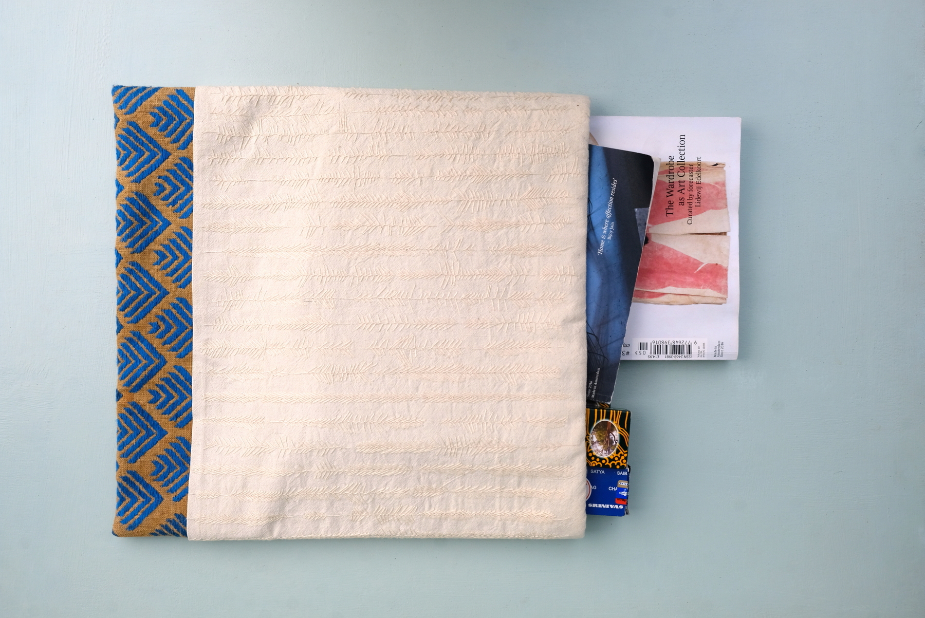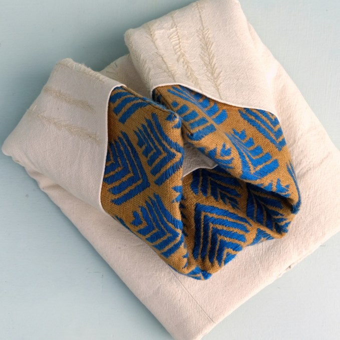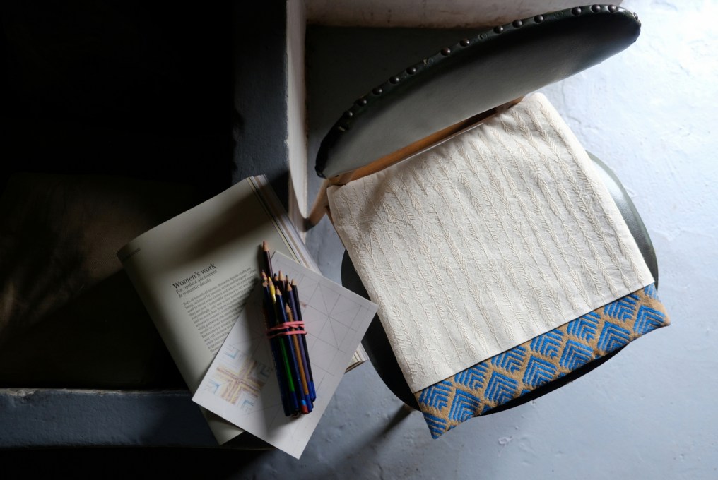 The material used for the embroidered part is hemp cotton from Nepal. The threads used on both pieces of fabric are DMC yarn.