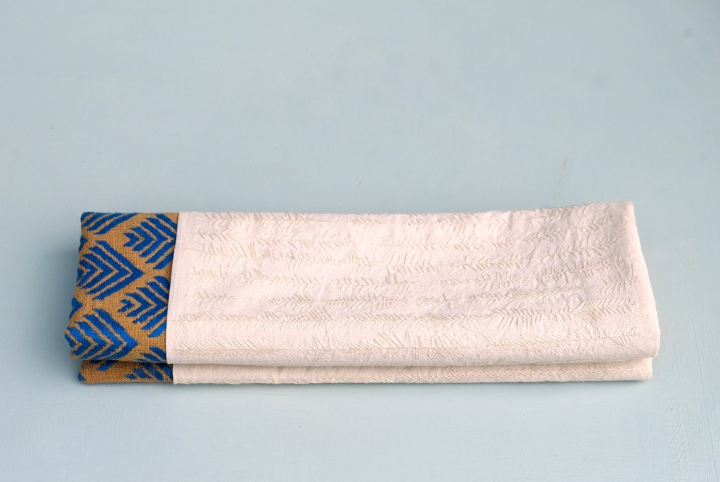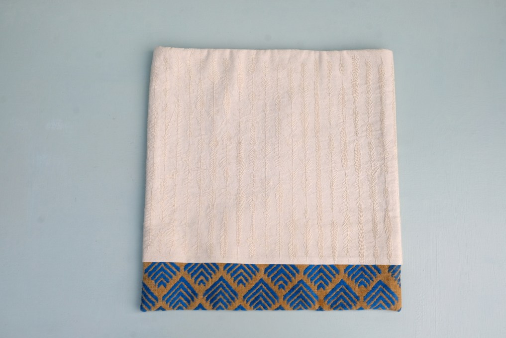 The cream colored fabric is unbleached cotton and the embroidered with a feather stitch.