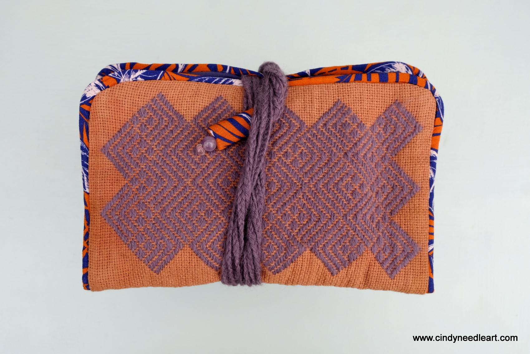 Fabric: the embroidered fabric is cotton and hand dyed with onion skins. The inside is cotton too, and comes from (left over fabric from which I made) clothes.