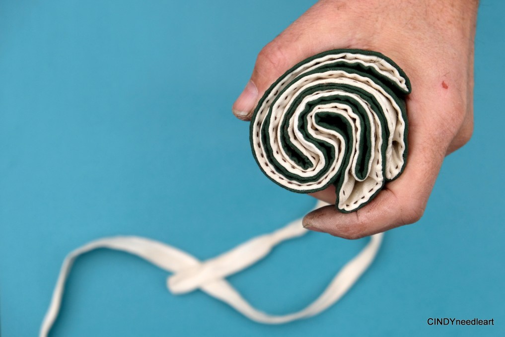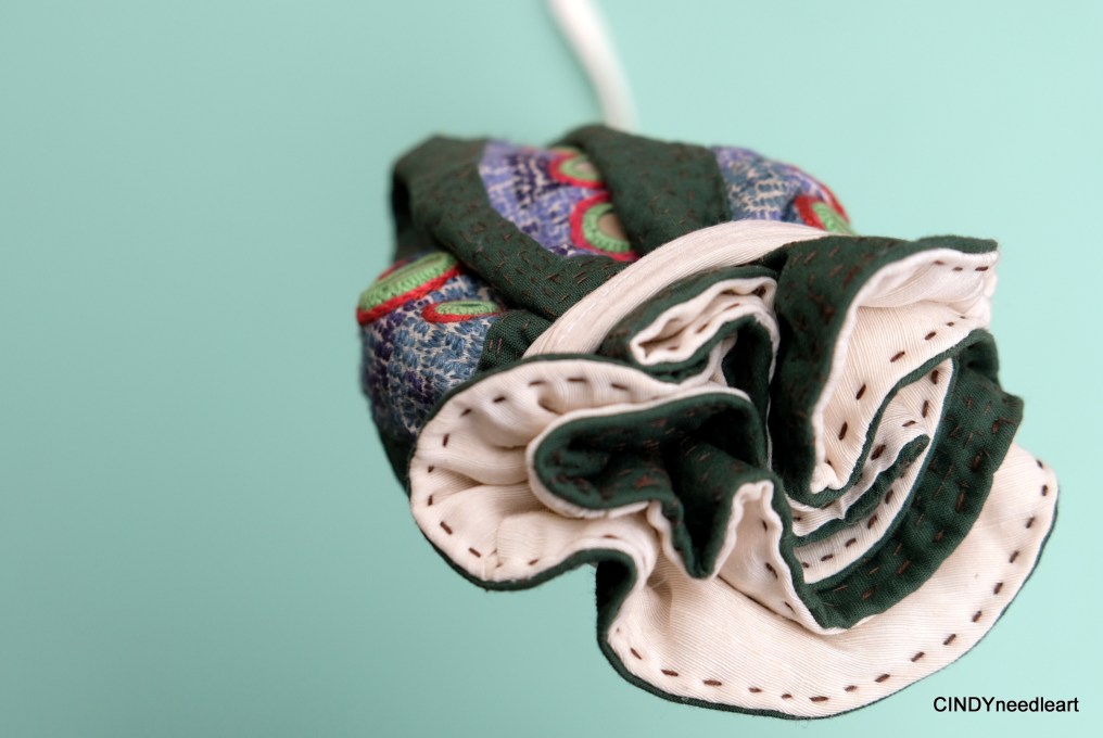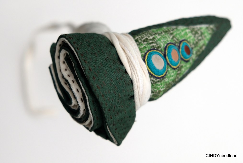 Fabrics: silk and hemp cotton mixture for the cream colored fabric from Nepal and cotton with synthetic mixture for the green fabric, which comes from an faded, worn-out shirt we’d bought in Bolivia.