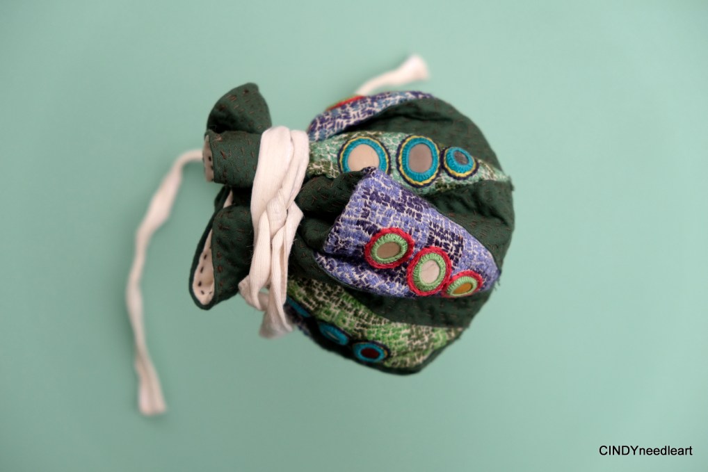 Technique: shisha mirror application (with stones), chain stitch and seeding stitch with topstitching and application on the green part.