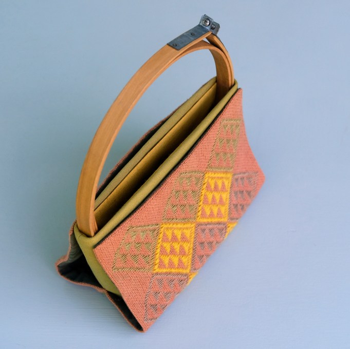 Fabric: the embroidered fabric is cotton dyed with onion skin. Both green fabrics are cotton (left overs from stitch projects). The yellow fabric is cotton dyed with goldenrod.