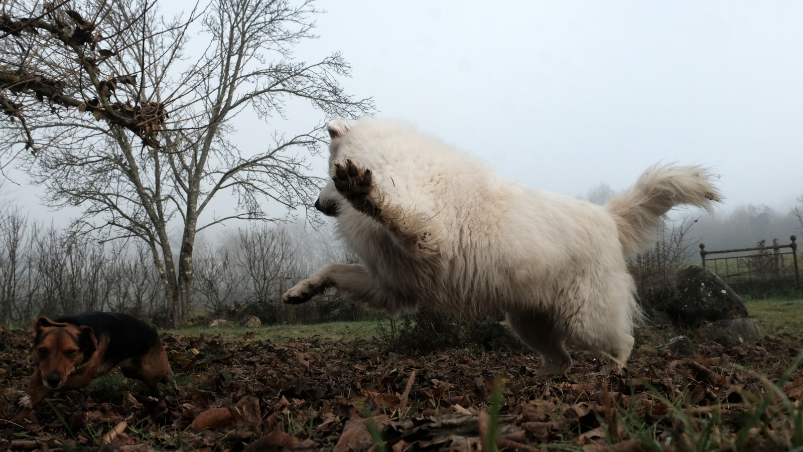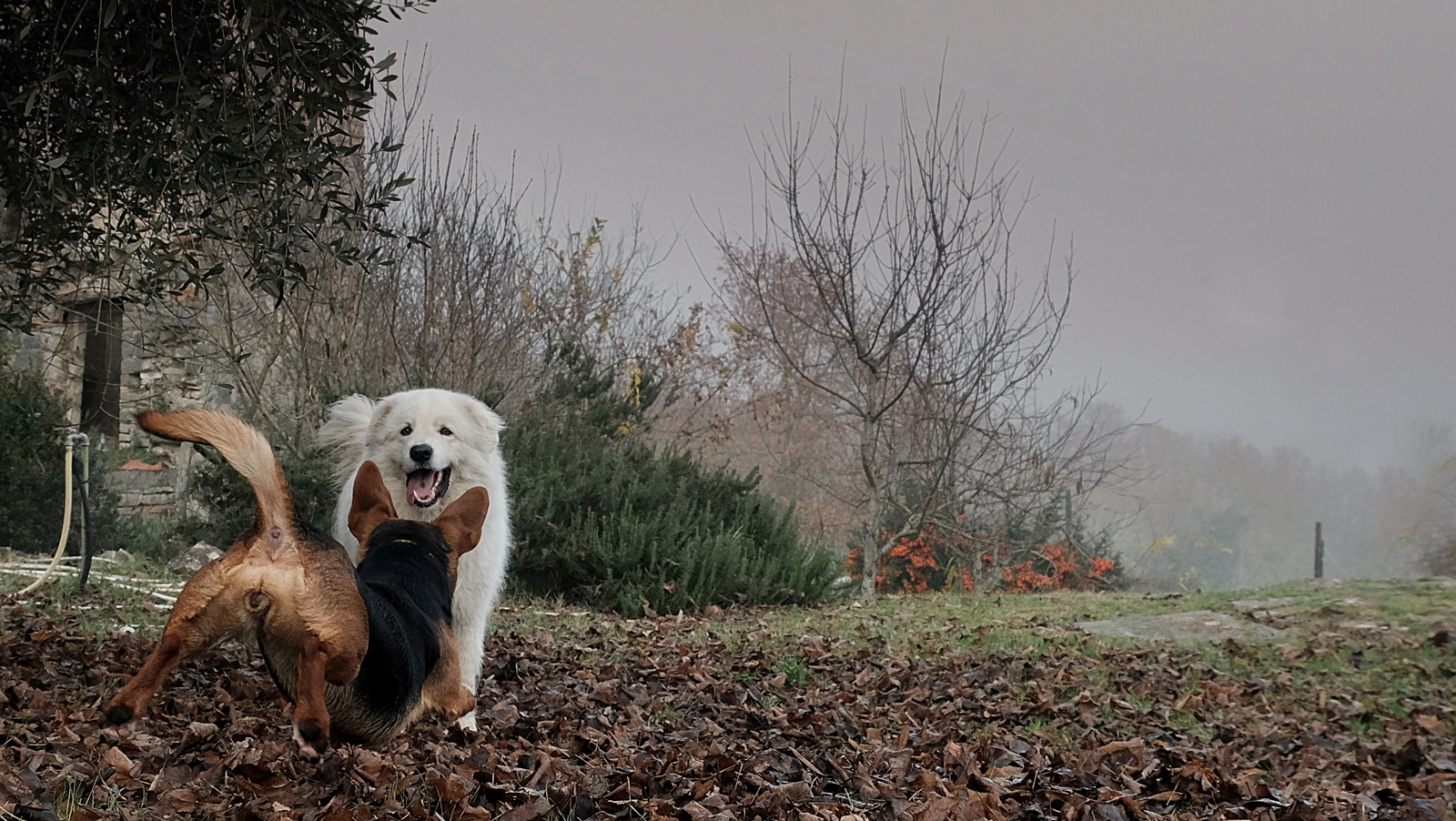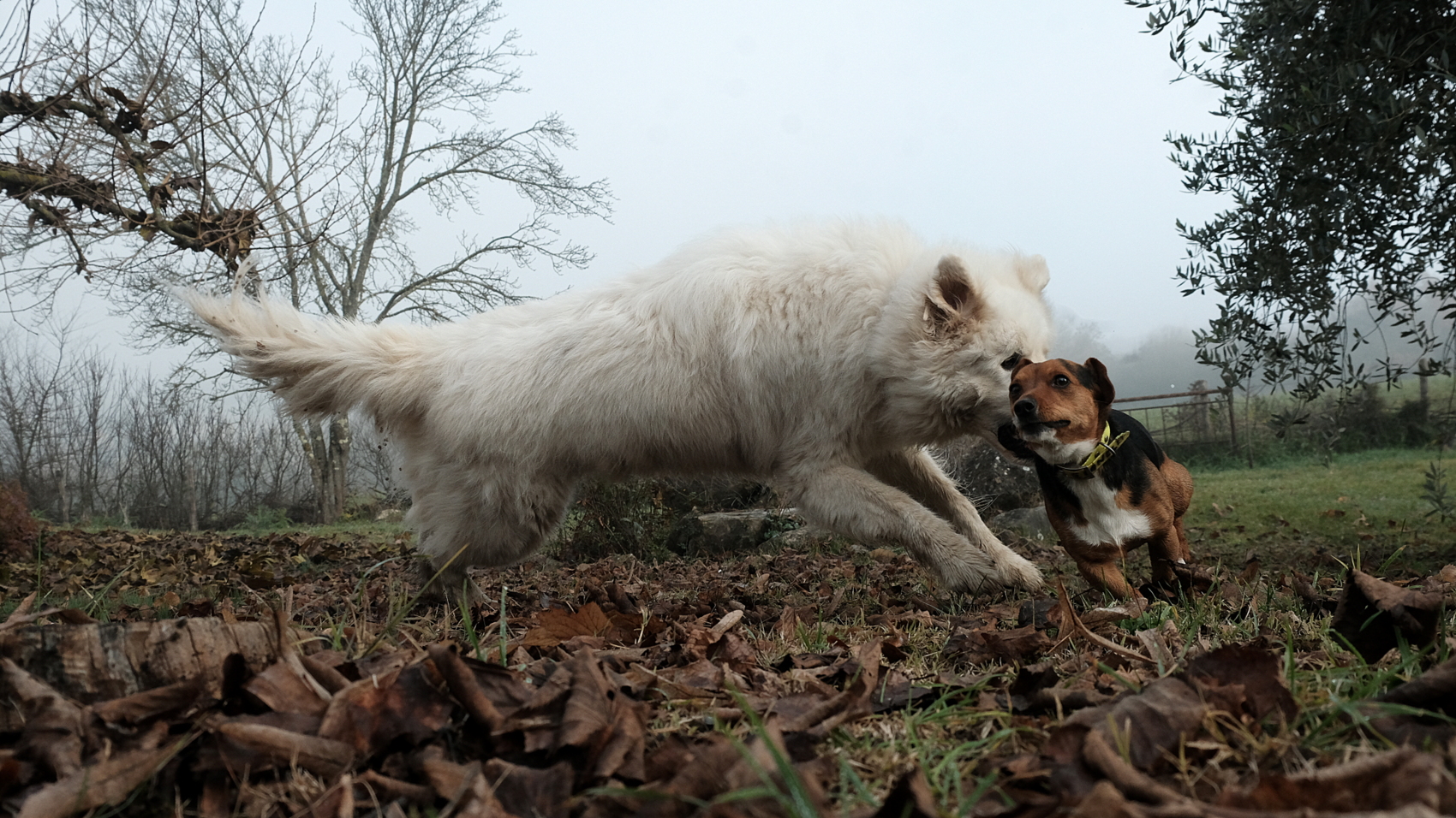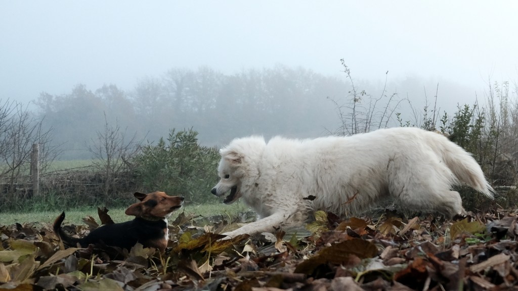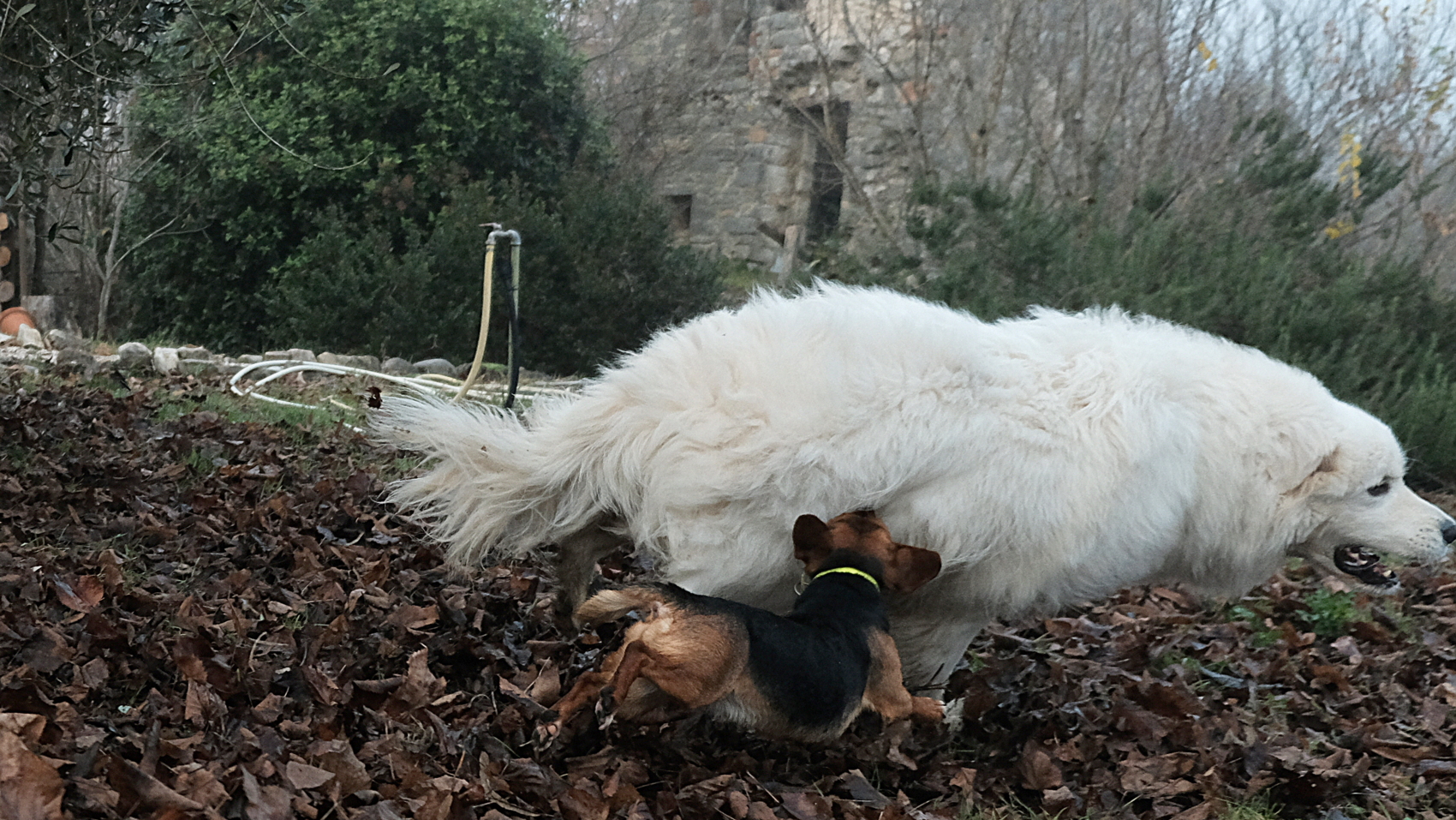 Walking the area by myself, a little dog tags along. It turns out Koos’ friend Gioiella. Koos is only interested in her when outside and only for the first few minutes. Their playing game seems unfair but my study shows they each have their own strength and indeed, are an equal team. Except when inside: my incompetence shows I have to learn a thing or two in dog behavior. Most wondrous is that we are afraid of these sheep dogs when hiking, yet it doesn’t have to. Or is that because we are now part of his flock?