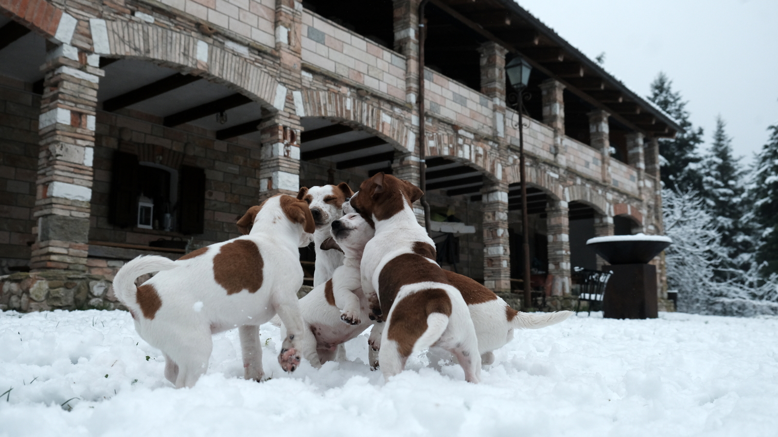 The Marche home: 2 Jack Russells who unexpectedly produced 7 puppies, 5 on the premises when we come, 1 mixed breed, 1 Maremmano, 1 Romanian Raven shepherd puppy, 2 cats, 4 chickens.