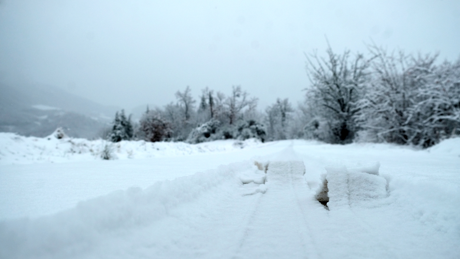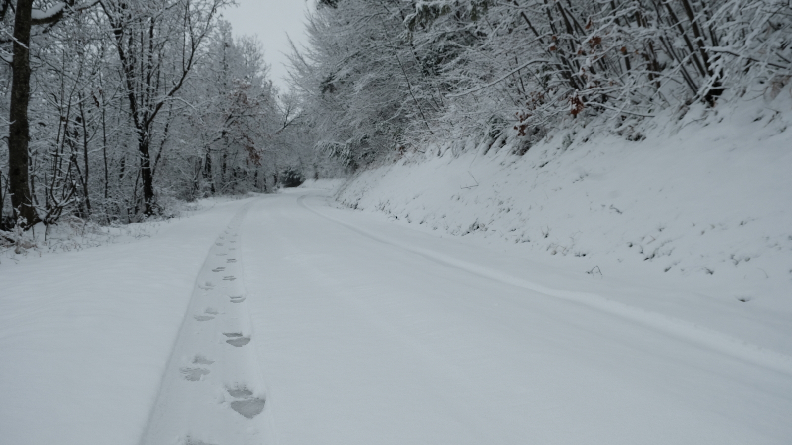 From a snow covered hill country Geo moves the van down to the main road while I walk. His tracks are the first in the snow and so he has some grip. A logic fact maybe yet I prefer to walk to keep my stress level below the rim of overspilling. Our stay has my tension rising high and it was only the fun that the many dogs gave that kept the balance in check. The discomforts, the cold, the kitchen so different than my own, the decoration and the lack of aloneness. By now, house-sitting starts to tug at the seams and pinch at the cuffs, as the fake down jacket I wear all day long.