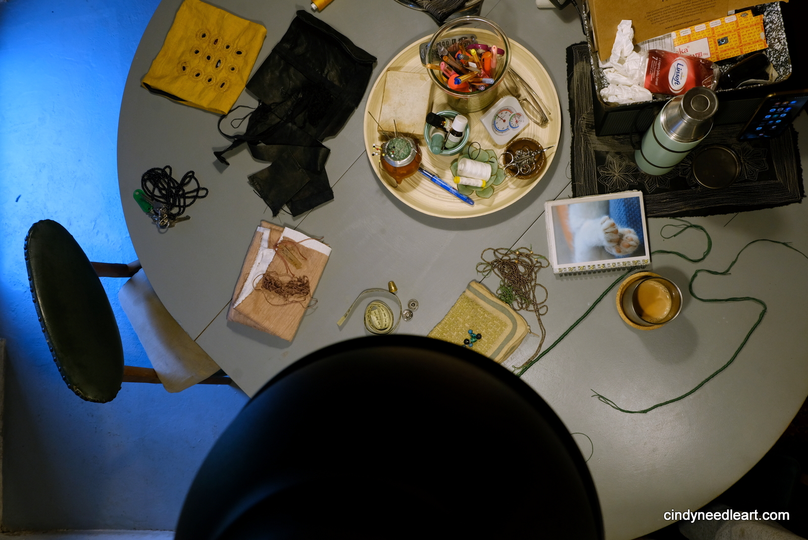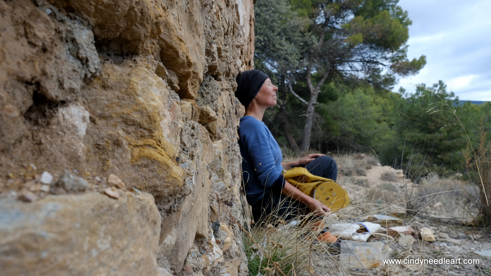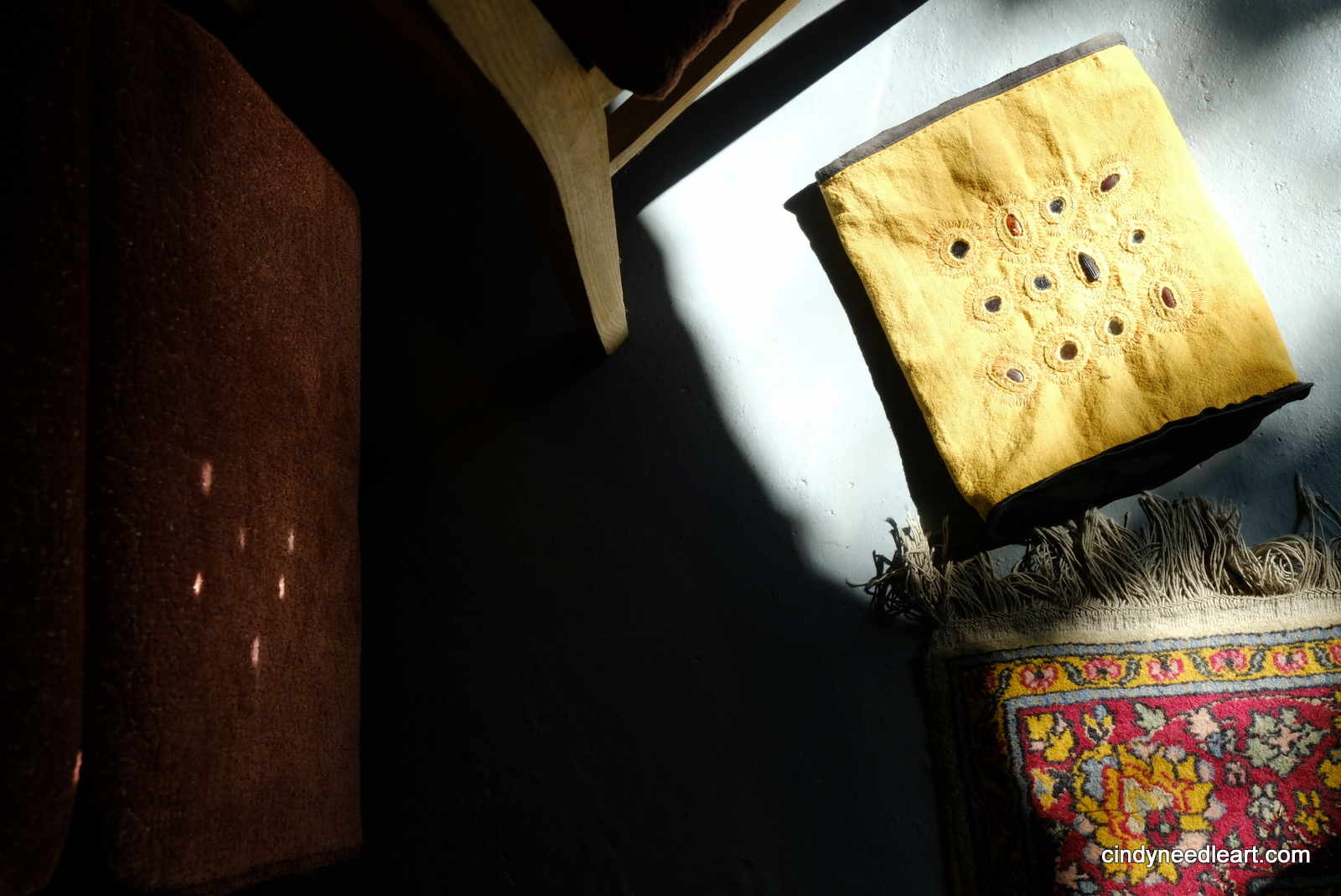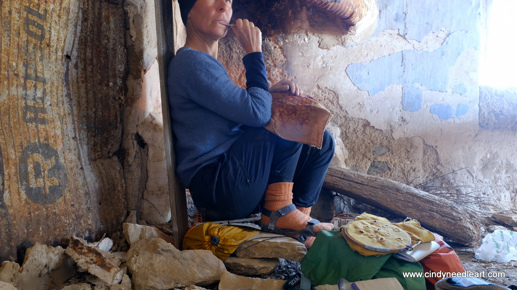 The fabric went with me when I walked for 6 weeks through Andalusia in Spain. The wings of beetle carefully wrapped in the folds of the golden colored fabric. It might look odd to use parts of insects to embroider with, but to me it comes natural. When I cycled through much of South America, I passed a lot of dead animals. Each time I stopped and inspect the wondrous animal that had been hit by a car. To be bend over a fox, which I normally only meet in camp spots, is seeing the animal up close. A nutria and skunk were never a possibility to see in detail. I found much more natural material. Like ostrich feathers, rabbit fur, deer hairs, llama wool, and wild boar hairs. The wild boars were hunted and eaten when I stayed at a military camp in Paraguay and there is where my very first inspiration came from.