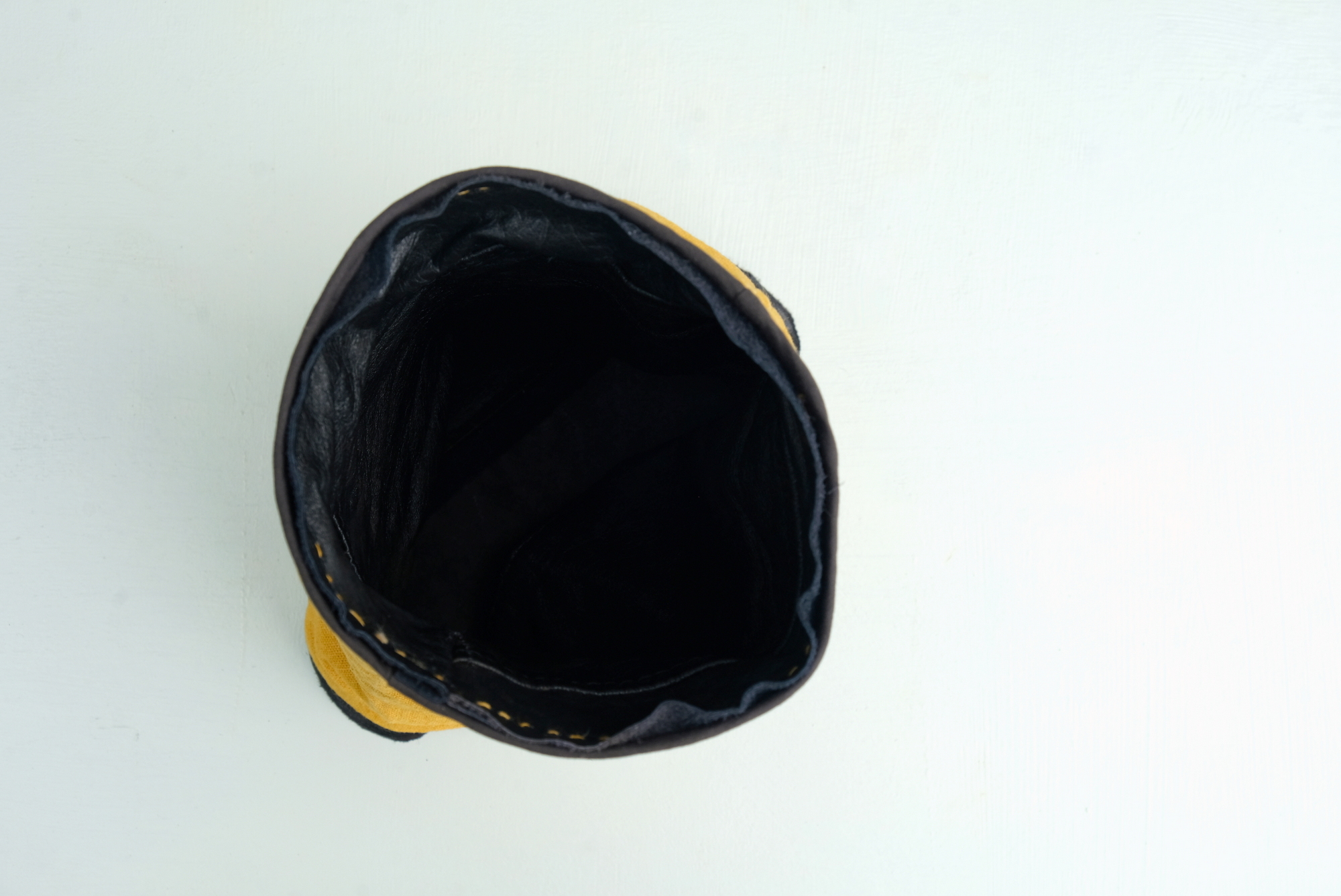 Although I very much dislike using leather as I don’t have the sewing machine for it, it makes for a total different look. Much of it is handwork with a special leather needle. Sturdy leather is not very bendable and because of this I opted for a double layer so the pouch would stand on it’s own. Becoming a holder of stuff that needs to be held together on a table in a very original way: a pouch stitched with wings and light.