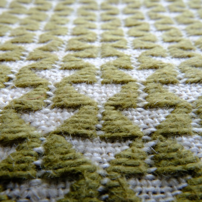 This stitch does not run horizontally from one side to the other side but focuses on each tiny built up of the figure, half of the little mountain shape, ‘cerrito’. This stitch goes up to down, down back up. Each half exist of 6 stitches and makes a full little mountain upon return. Because the fabric is uneven and tightly woven, it makes for a difficult counting of each opening in the fine fabric.