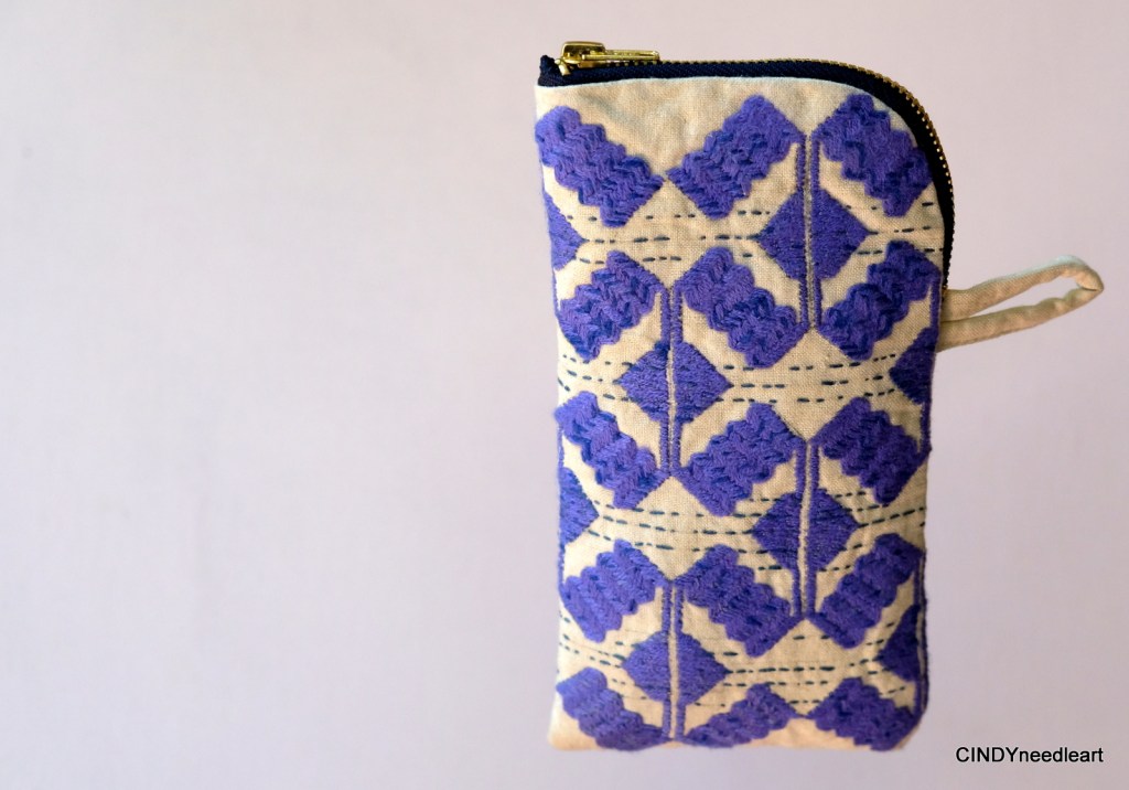 Fabrics: silk/hemp cotton for the outside and a blue cotton mixture for the inside. I have dyed the outer fabric with kurkuma but not mordanted the fabric (which means the soft yellow color will fade while washing). This pouch is padded for protection and could be used for a pair of sunglasses or to store your phone.