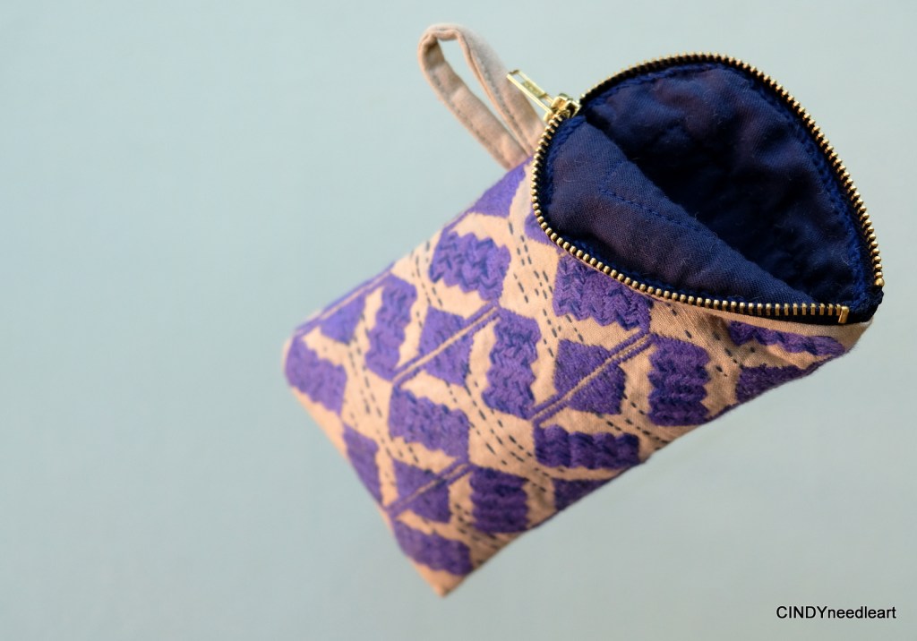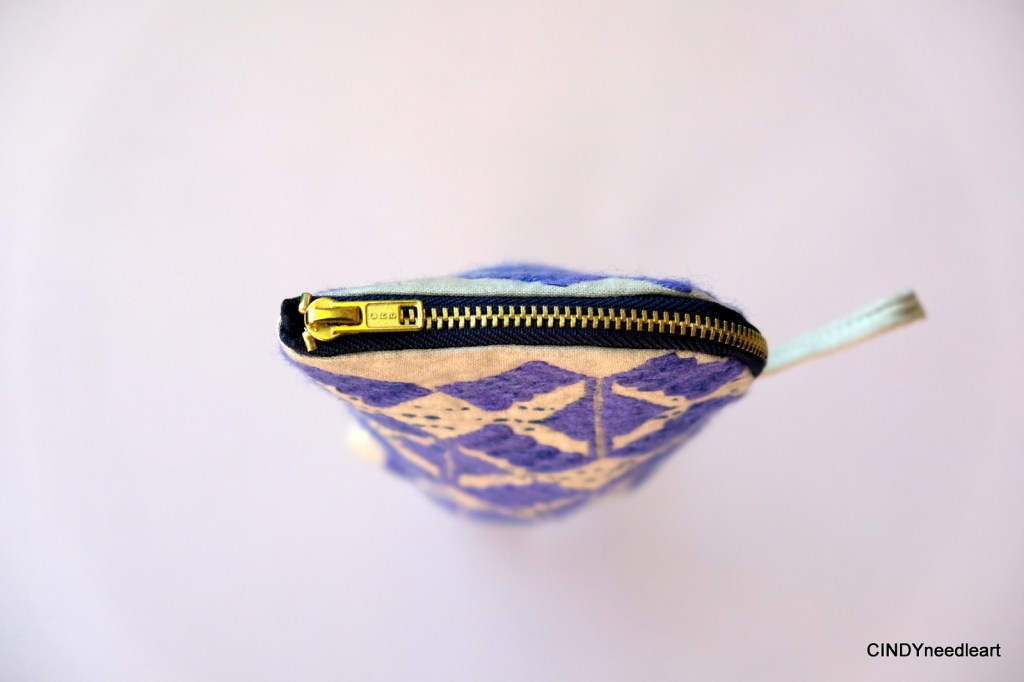 Technique: straight stitch and running stitch with inside a broken chain stitch along the zipper and lining.