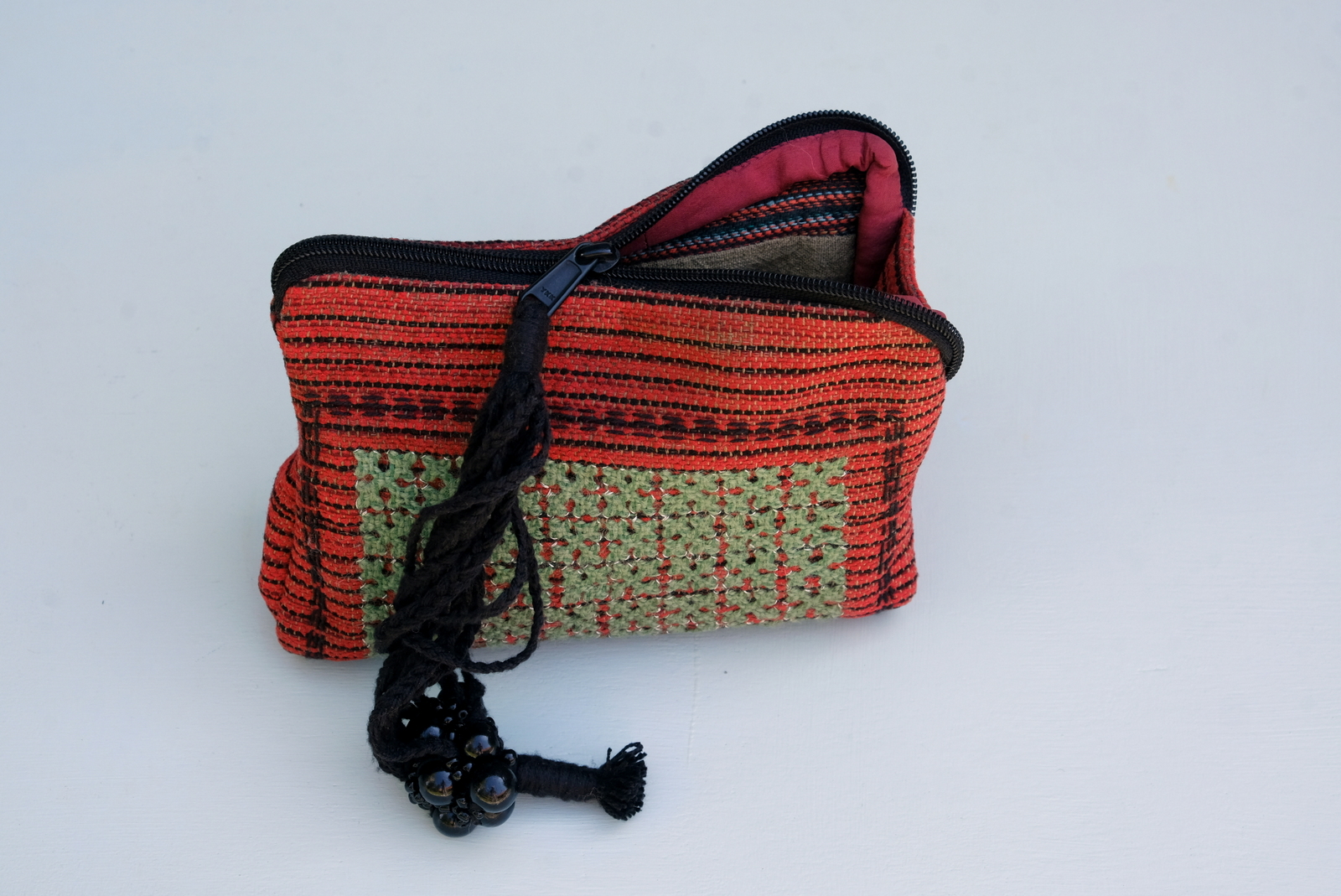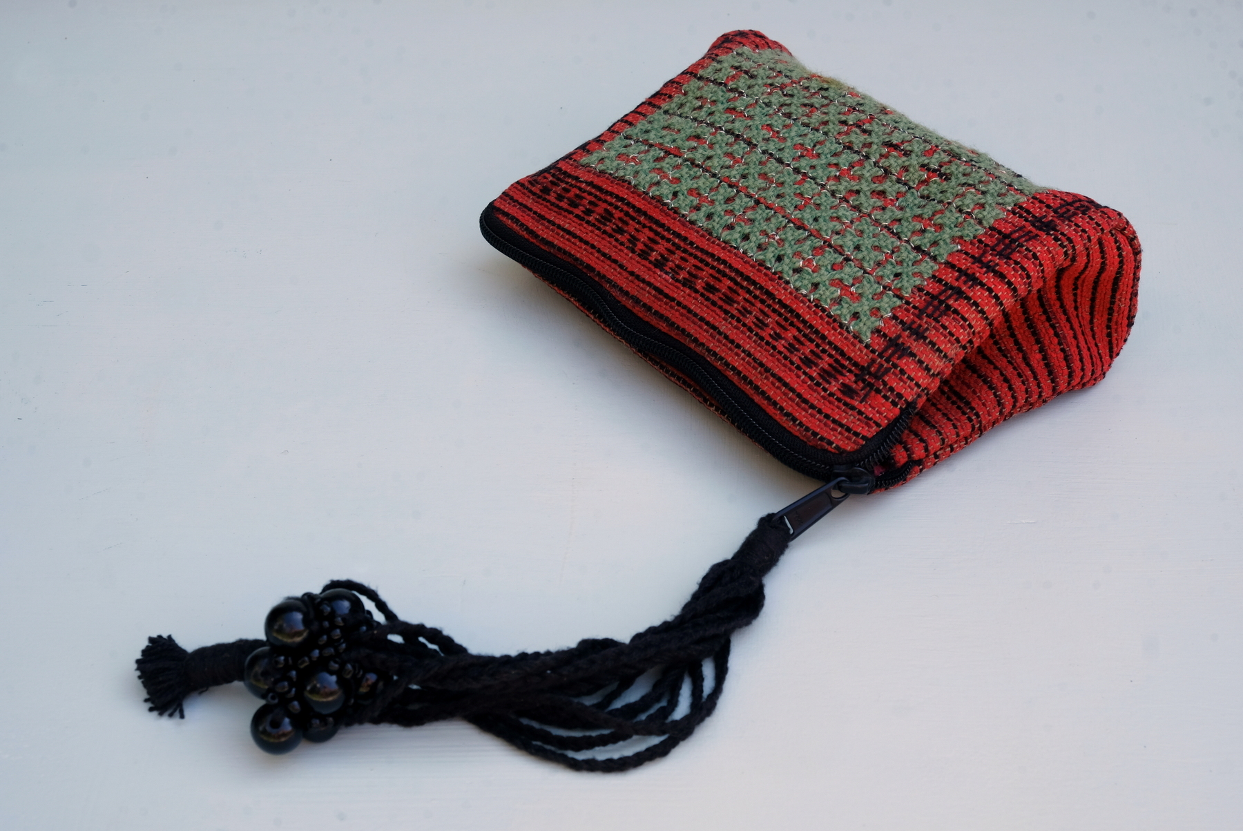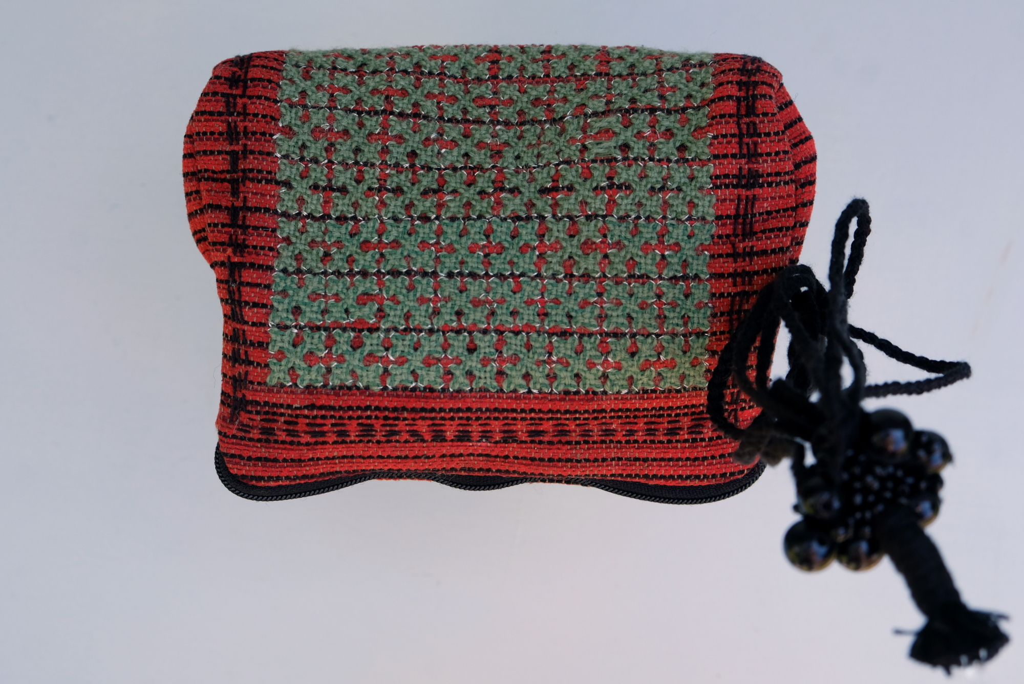 Yarn: DMC cotton, wool and silver thread. The drawstring is cotton as well, originating from Pakistan.